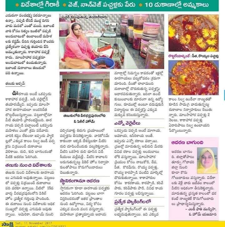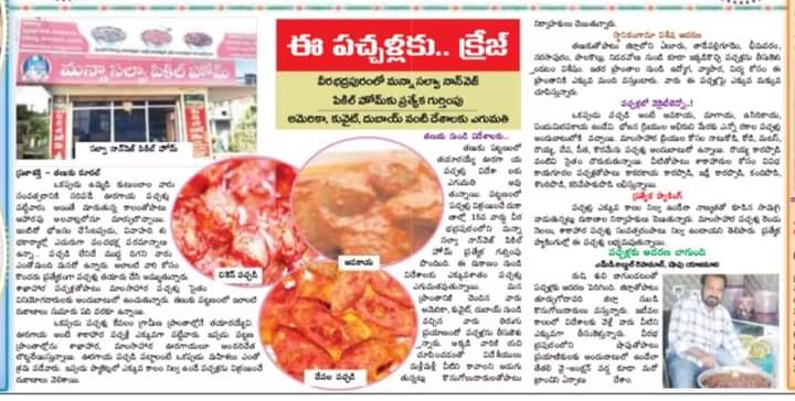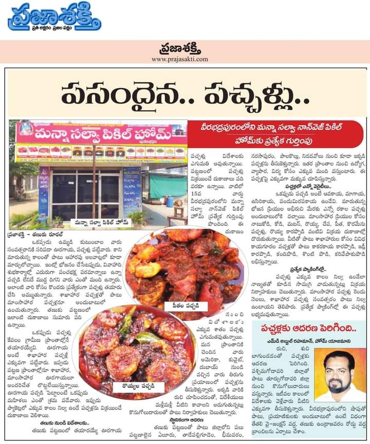 Manna Salva Pickles has earned recognition for its exceptional quality and traditional flavors. Customers rave about our homemade, preservative-free pickles and karappodi varieties, praising the authentic taste of Andhra in every bite. We have received positive reviews from numerous satisfied customers who appreciate our commitment to hygiene and the finest ingredients. Our pickles have also been featured in several newspapers for their unique, high-quality offerings. We take pride in consistently delivering excellence and customer satisfaction.